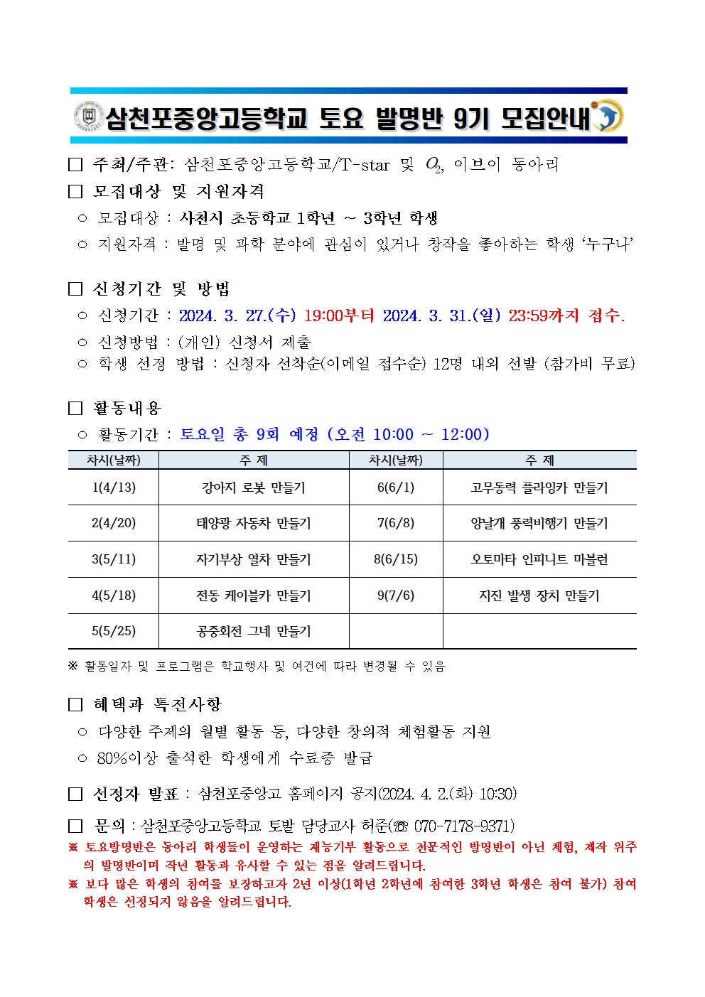 2024. 고교학점제 도입 역량강화를 위한 삼천포중앙고등학교 토요발명반(9기) 모집